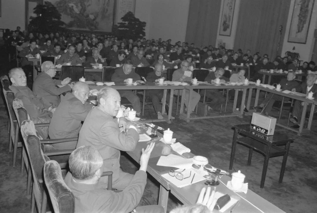 由全国人大法律委员会和全国人大常委会法制工作委员会召开的民法通则(草案)座谈会,1985年12月4日开始在北京人民大会堂举行。图为彭真委员长在会上讲话。新华社记者 王新庆/摄