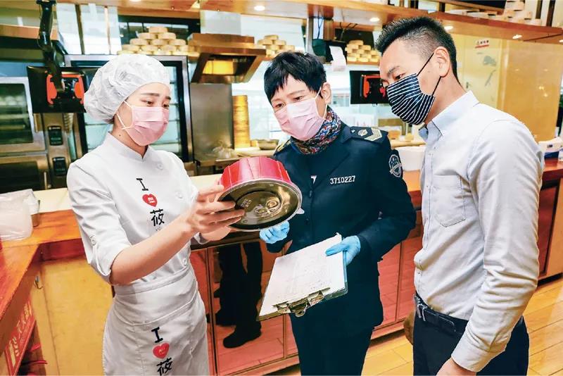 图为2020年2月5日,山东省青岛市崂山区麦岛市场监管所执法人员对一家餐饮企业包装餐具进行检查,确保餐饮行业安全有序复工。中新社记者 解豪/摄