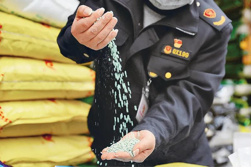 图为2020年3月14日,贵州省毕节市七星关区市场监管局综合执法大队工作人员在检查农资经营户销售的化肥质量。中新社记者 韩贤普/摄