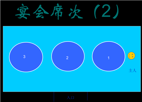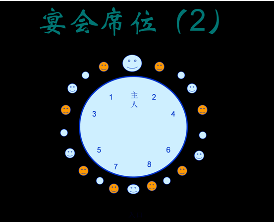 主人和主宾位置一般居中,与其他座位间隔一定距离(以示突显)。