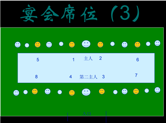 主桌中间的位子是上位,因而,主人居中背墙而坐,主宾位于主人右侧第一位(圆桌的尊位)或对面中间的席位(长桌的尊位)。
