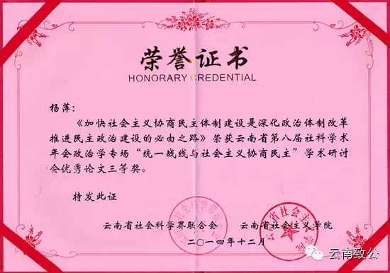 本次研讨会联系云南实际和统一战线工作,共征集到论文90余篇。经过评审,共选出50篇优秀论文。致公党云南省委秘书长杨萍论文《加快社会主义协商民主体制建设是深化政治体制改革推进民主政治建设的必由之路》荣获优秀论文三等奖。
