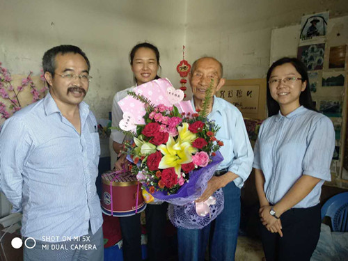 9月23日是抗战老兵王炳秋95岁的生日,9月22日,致公党蒙自市支部向王老送上生日蛋糕、鲜花和祝福,祝福王炳秋生日快乐、健康长寿,据了解,王炳秋1923年9月23日出生北京书香门第之家,1941年王炳秋考取交通大学唐山工程学院,1944年,弃笔从戎,到中央训练团培训学习结束为美国十四陆军航空队做翻译,他是二战期间翻译的奇才,他精通英语,会说上海、广东、云南、浙江等本地方言,懂十国语言,人生命运多舛 他淡然处之。他结合自己的人生道路,尽管人生道路坎坷,经受了种种考验,他也民主党派人士(九三学社社员),对致公党蒙自新党员进行爱国教育,勉励大家同心同行,对红河州的经济社会发展积极参政议政,建言献策。(赵滇)