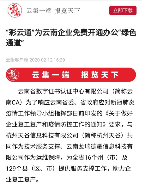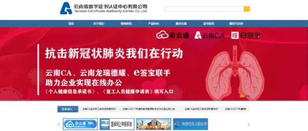 2月9日,中共云南省委省政府应对新冠肺炎疫情工作领导小组指挥部印发《关于做好企业复工复产和疫情防控工作的通知》,要求复工企业必须按照有关要求填写《个人健康信息承诺书》和《复工人员健康申请表》。为更好抗击疫情,帮助企业及相关单位实现不见面资料填报,云南省数字证书认证中心第一时间积极快速响应号召,于2月10日紧急研发上线了"彩云通"在线填报签署平台,并免费向社会提供。企业或自然人通过手机扫码、电脑登陆平台等方式,就可实现《承诺书》和《申请表》的在线签署,不受时间和环境的限制。上述创新举措让具有复工需求的企业及员工足不出户就可以享受数字证书带来的便捷服务,减少了人口聚集和交叉感染的风险。