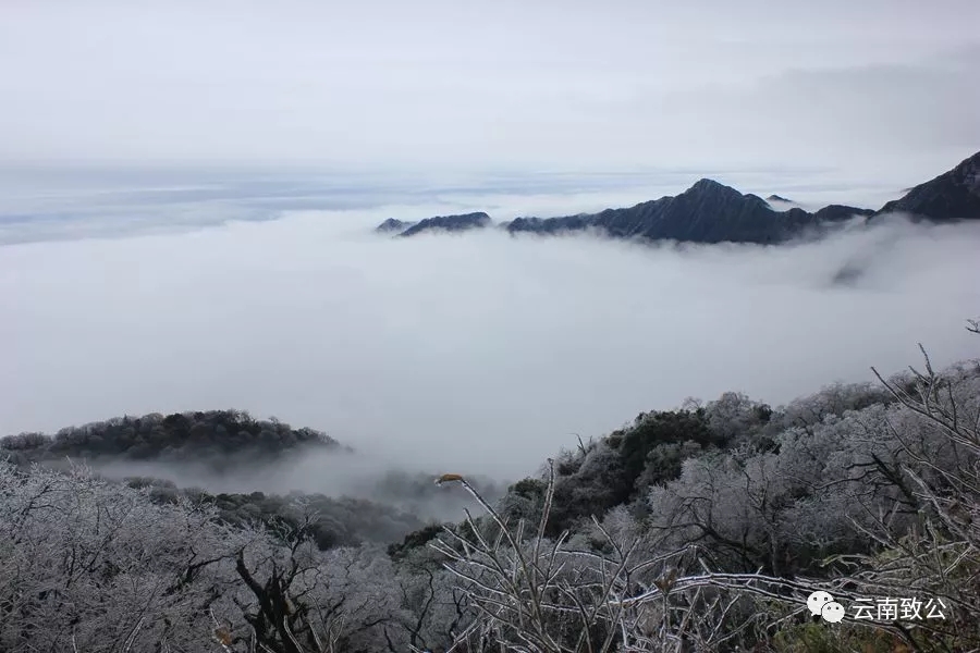 作品说明:摄于贵州梵净山。当天天气阴,但上到山顶后,天气变冷显现冰晶和云雾天气,非常壮观。