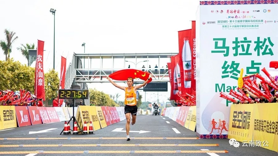 作品说明:2018年南宁国际马拉松赛现场,运动员带着五星红旗奔跑在赛场上。