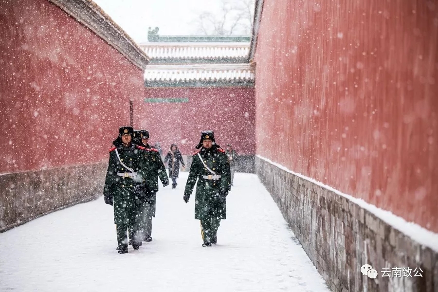 作品说明:一场冬雪为故宫笼上了穿越时空的美感,白雪、红墙、绿瓦,好似一副中国画。最美的还是不惧严寒、在风雪中巡逻执勤的人民卫士,在紫禁城红墙的衬托下,深绿色的军装显得格外亮眼。