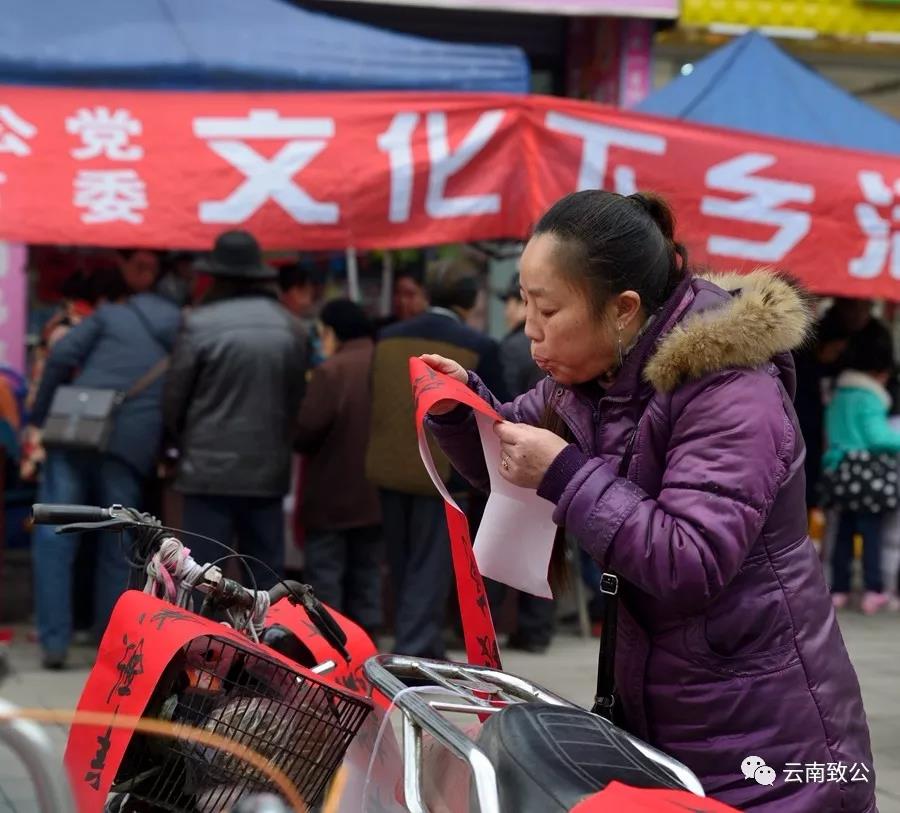 作品说明:老百姓在收到致公党乐山市委文化下乡活动赠送的春联后急切地想吹干春联,在她身后的文化下乡活动点已经挤满了人。
