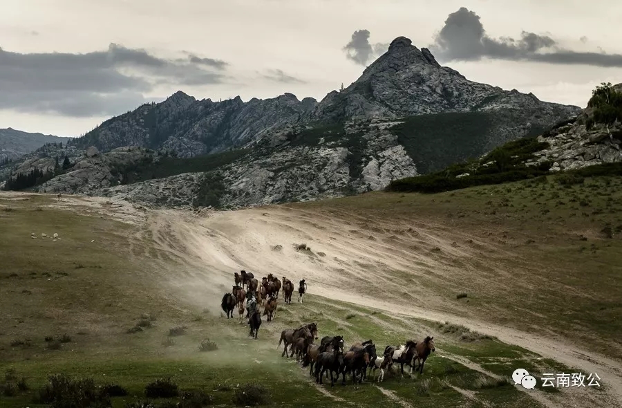 作品说明:在茫茫的新疆大地上,有一群马儿从石黑的山中呼啸而过,游走在灰绿的草地上,天色渐暗,牧马人驱赶着马群奔跑在回家的路上。