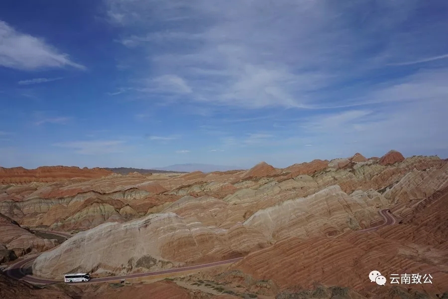 作品说明:雨后的张掖,七彩色泽浓烈,恰好在蓝天白云下,一部白色旅行车经过,载着人们前往下一处景点,如同是好奇的七色鹿在世间探索。