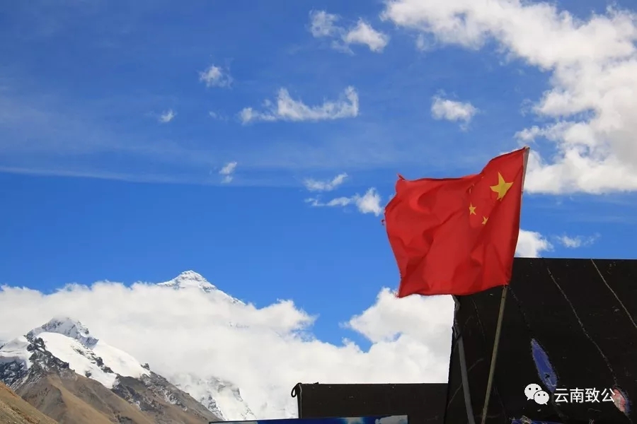 作品说明:离珠穆朗玛峰最近的哨所上空飘扬的红旗。