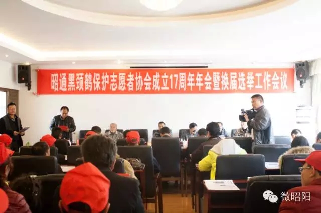 11月28号下午,昭通黑颈鹤保护志愿者协会举行成立17周年年会,该会举行成立17周年年会暨换届选举工作,第二届理事会主席王昭荣回顾了协会二届理事会11年以来的工作情况,协会常务理事钟龙作了协会2015年度财务收支报告;会议表彰了扎根一线从事护鹤工作的昭通5名护鹤员为2015年度"优秀志愿者";选举出13名理事会成员,并安排今冬明春协会工作,最后,黑颈鹤保护协会分会会员还作了表达发言。