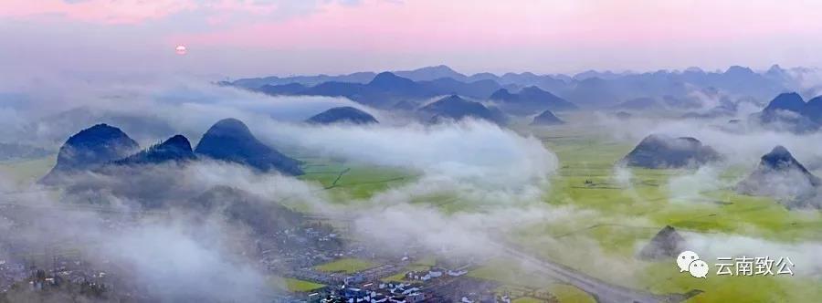 作品说明:从远处眺望,罗平油菜花海云雾缭绕,像是一个世外桃源。