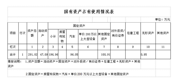 截至2016年12月31日,资产总额291.02万元,其中,流动资产93.21万元,固定资产196.96万元,无形资产0.85万元,(具体内容详见附表)。与上年相比,本年资产总额增加0.90万元,其中固定资产总额减少45.10万元。处置车辆2辆,账面原值51.76万元;实现资产处置收入0.09万元。