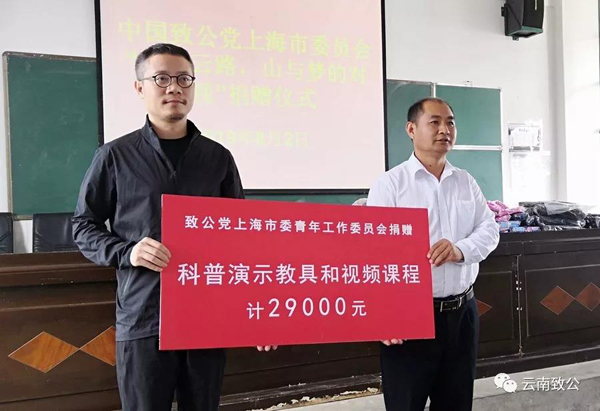 姚薇主任说,一直以来,致公党上海市委非常关注贫困地区教育事业的发展,特别是与云南省有着深厚的渊源。在今年5月举行的致公党上海市委"年度爱心义卖"活动中,致公党上海市委青委会特设了云南帮扶的义卖专位,在云县华芳农业科技公司的协同下,将云南省临沧的土特产如小金针红茶、澜沧江云窖、养老爷、哥俩好以及司岗里木瓜酒、核桃油等通过线上线下同步销售,在很短的时间里共募集了爱心款。此次捐赠总计价值83438元,不仅有致公上海市委爱心义卖筹得的资金,还有青委会成员的爱心捐款。希望通过捐赠活动,通过"科普进山"活动,让孩子们能感受到科学的发展、知识的更新,帮助小朋友们树立正确的人生观,养成"关心他人,感恩奉献"的思想作风和社会责任感。