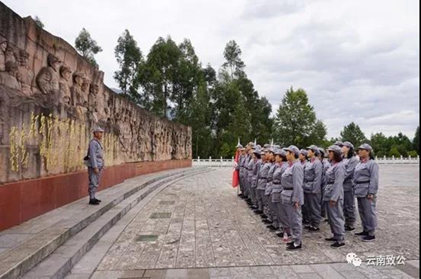 "长征永远在路上,每一代人都要走好自己的长征路。"为了深刻感受红军长征的艰苦历程,弘扬好伟大的长征精神,参加活动的党员们身着红军服、红军鞋,首先瞻仰了中国工农红军长征过鹤庆纪念碑,为在长征牺牲的红军烈士默哀,向纪念碑敬献了花篮和鲜花,并在红军长征过鹤庆浮雕墙前聆听了红军长征过鹤庆时军民鱼水情深的感人故事。党员们在浮雕墙前深情朗诵毛泽东的《七律·长征》,从大气磅礴的诗词中再次感受红军长征的峥嵘岁月。