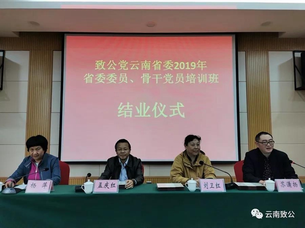 11月1日,致公党云南省委2019年省委委员、骨干党员培训班结业式在重庆社会主义学院举行。致公党云南省委副主委孟庆红、刘卫红出席,二级巡视员、秘书长杨萍主持。受重庆社会主义学院领导委托,二级调研员、中华文化工作部干部苏潇扬代表社院出席。