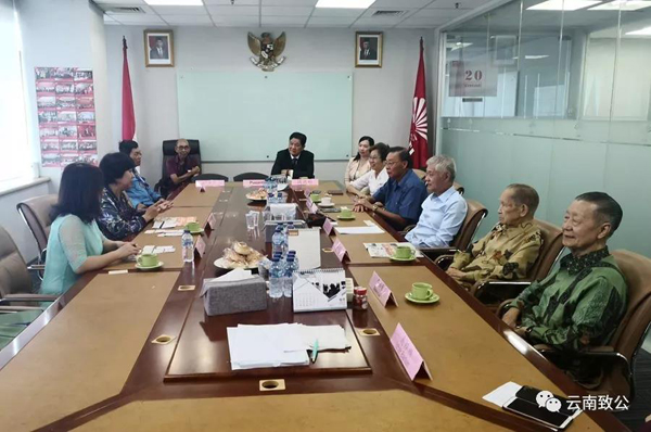 在印尼访问期间,代表团拜访了印尼华裔总会,与印尼华裔总会副总主席张锦泉、资深荣誉顾问唐裕、顾问李焕章、副秘书长连绍鹏、印尼华文教育联合总会副主席郑洁珊等进行了座谈交流。张锦泉介绍了印尼华裔总会的成立过程及任务和使命,杨萍介绍了致公党的简要历史和侨海特色,云南省的经济社会发展情况,双方还就华文教育师资匮乏等方面进行了深入探讨,望通过此次联系,加强沟通,共同为华文教育的发展做出积极的努力。
