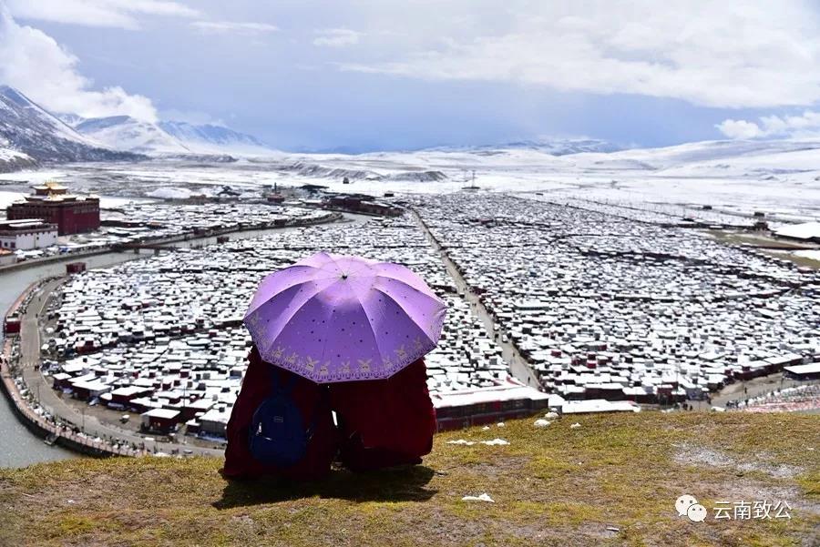 作品说明:两位觉姆远望雪中的亚青寺。
